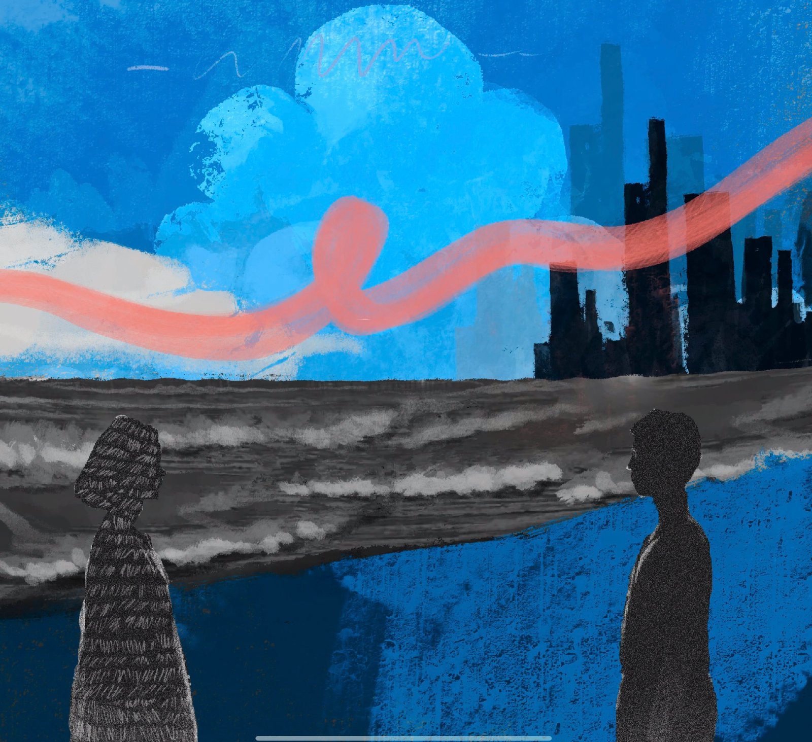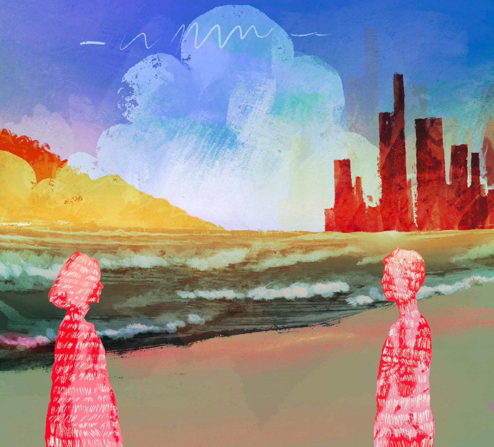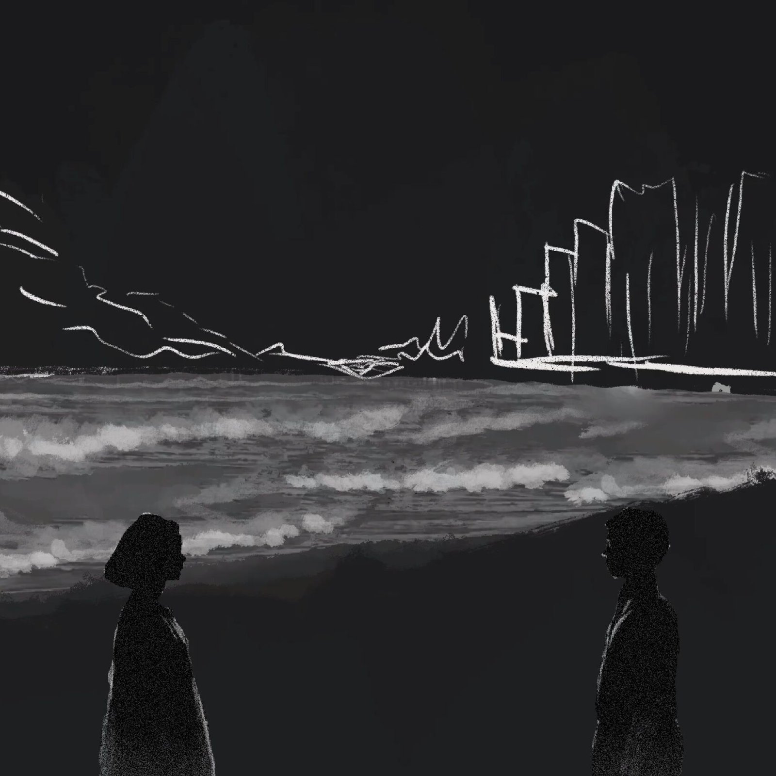 For DreamNote’s song Kinaare, an album art was illustrated capturing the theme of two people living apart but always drawn back to each other. The artwork features individuals in different landscapes—mountains and city—connected by the sea and sky, using cool colors to evoke that push-and-pull emotion. Listen to it here.